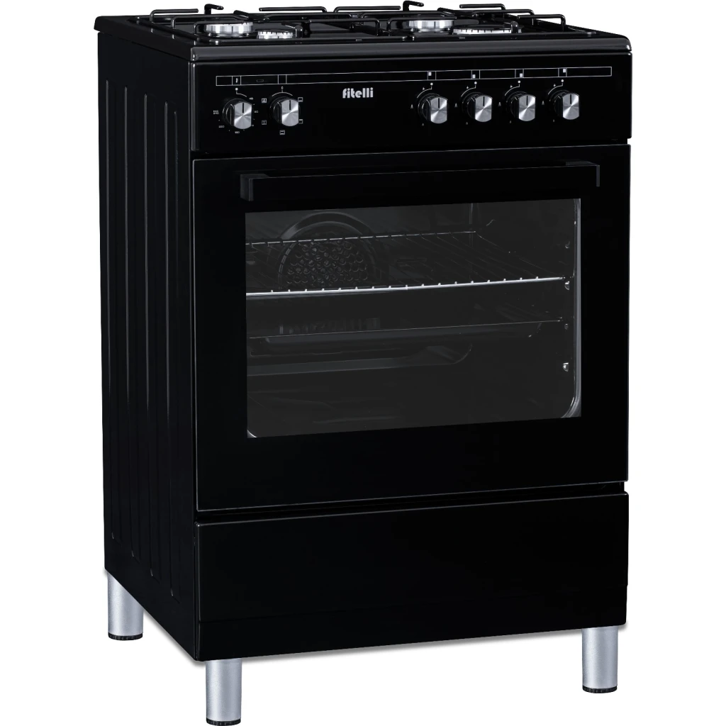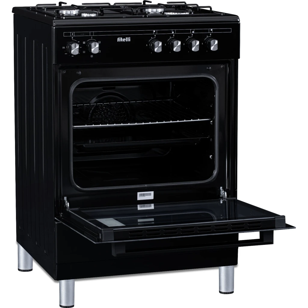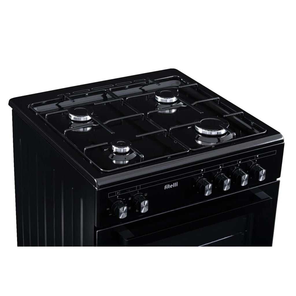 De Fitelli FG6001ZW is een stijlvol en veilig gasfornuis van 60 cm breed, uitgerust met een veelzijdige elektrische oven. Het zwarte design past naadloos in elke moderne keuken.