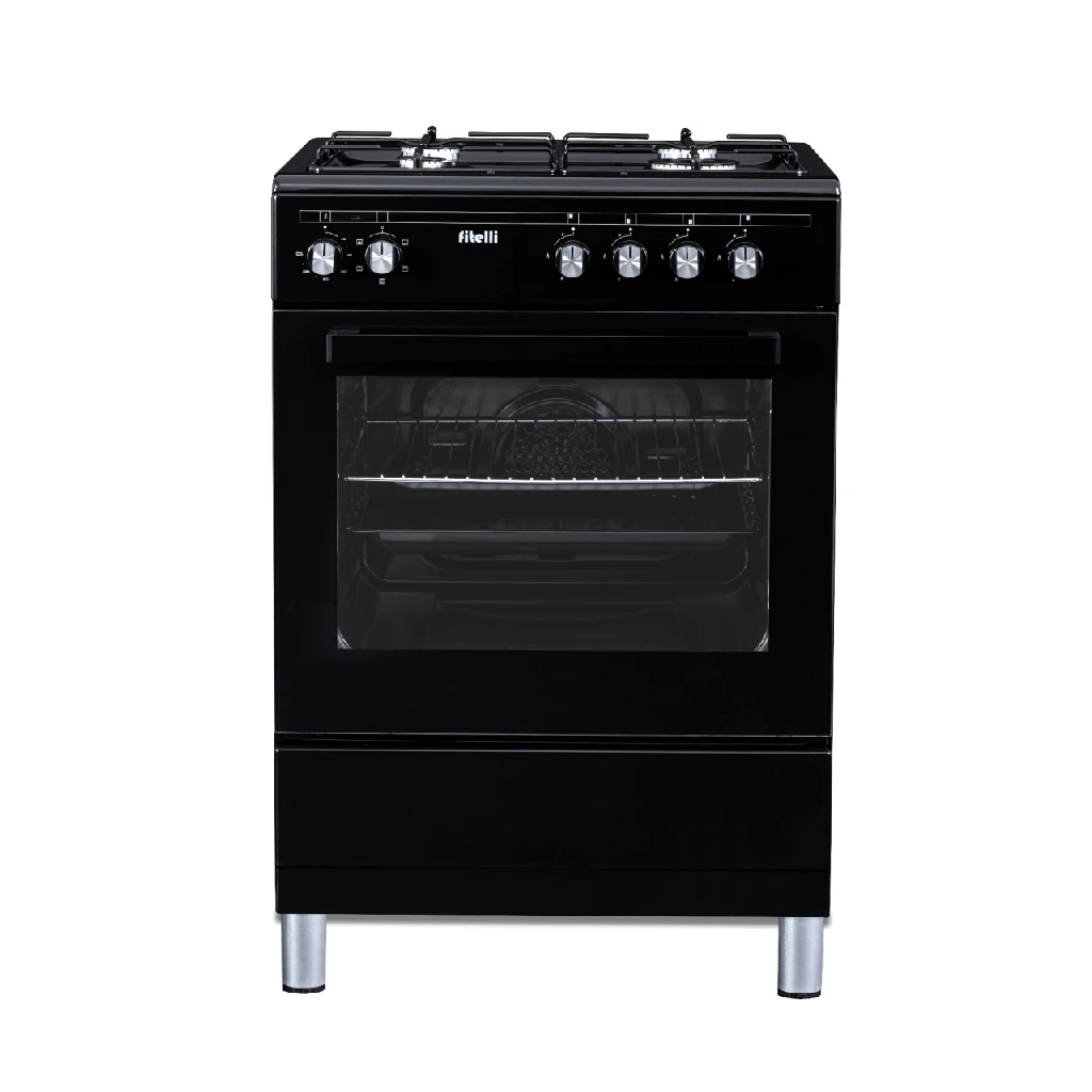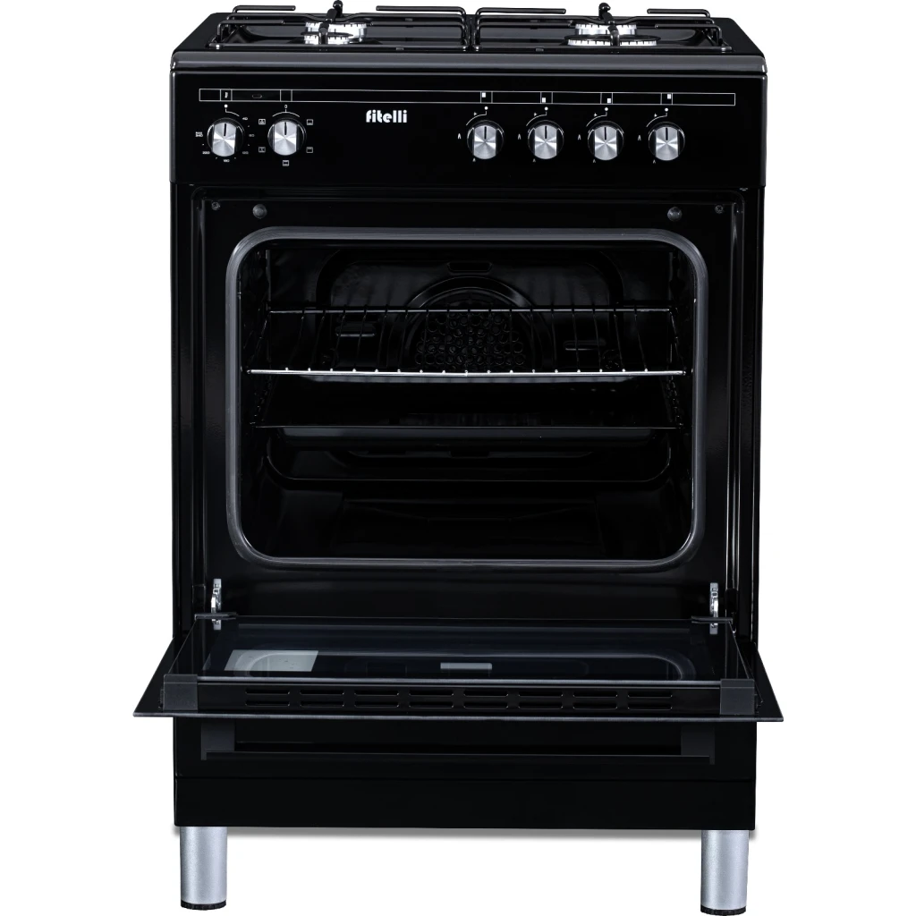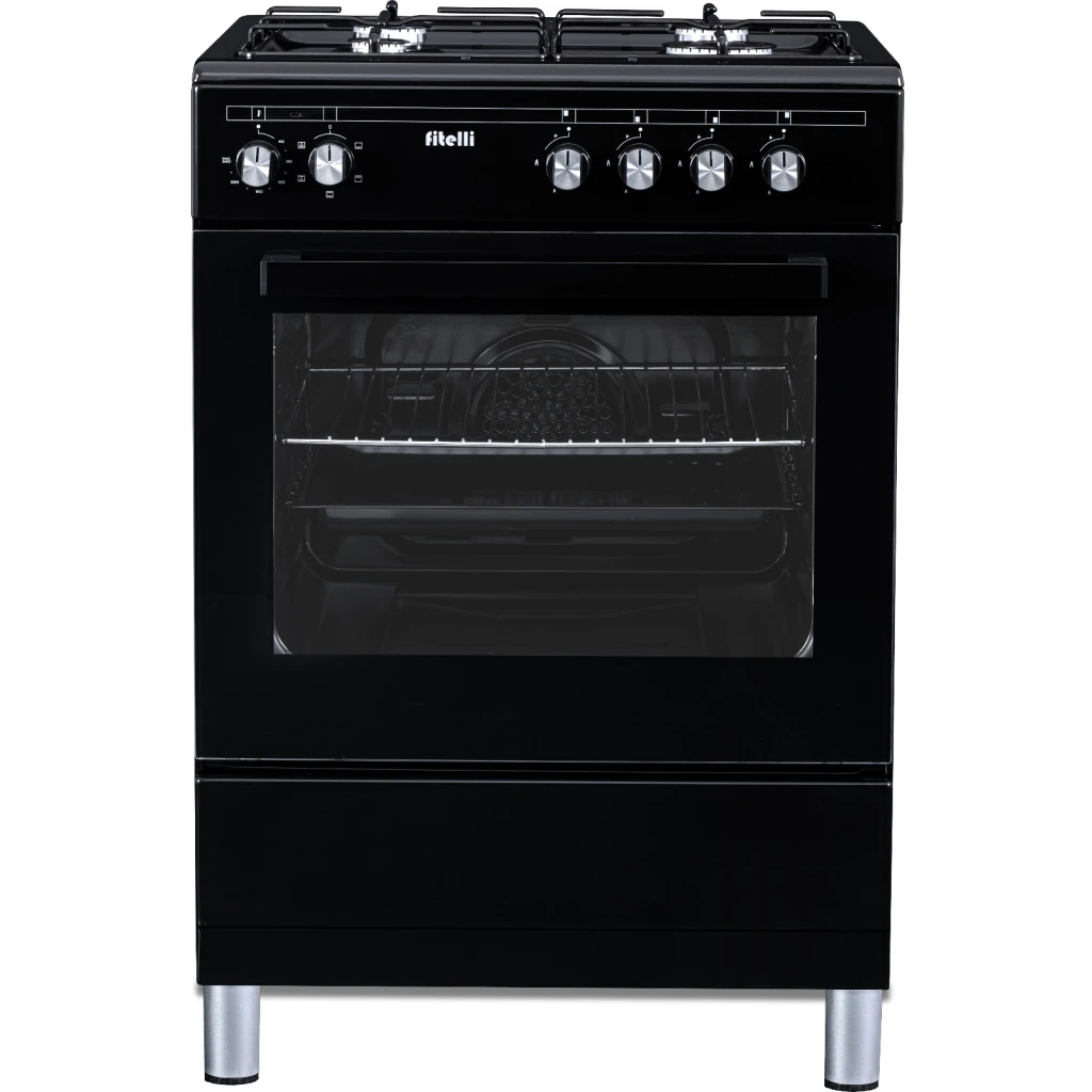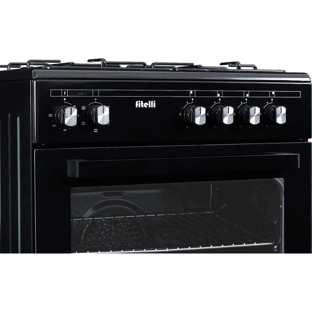 De Fitelli FG6001ZW is een stijlvol en veilig gasfornuis van 60 cm breed, uitgerust met een veelzijdige elektrische oven. Het zwarte design past naadloos in elke moderne keuken.